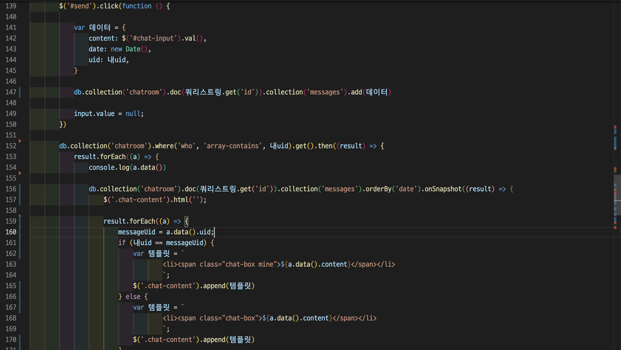 db.collection('chatroom').doc(채팅방id).collection('messages').orderBy('date').onSnapshot((result) => {